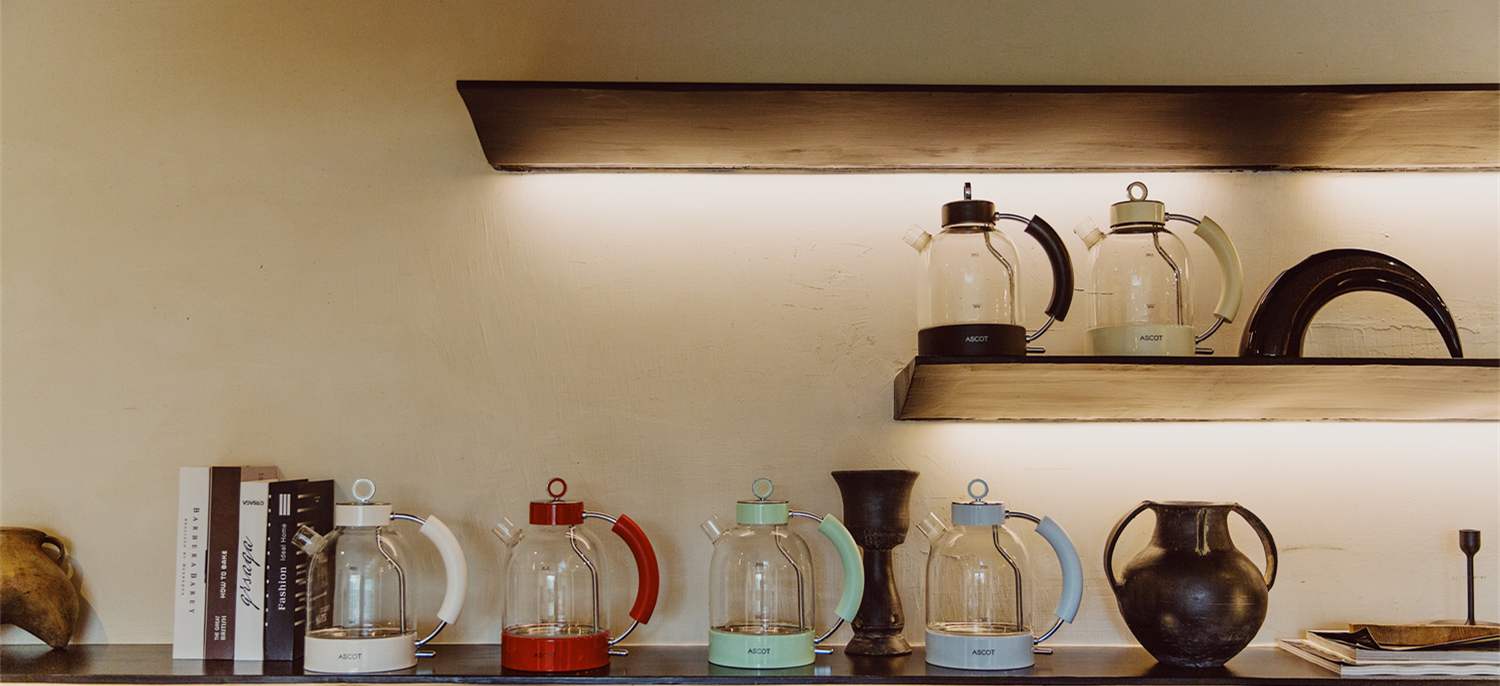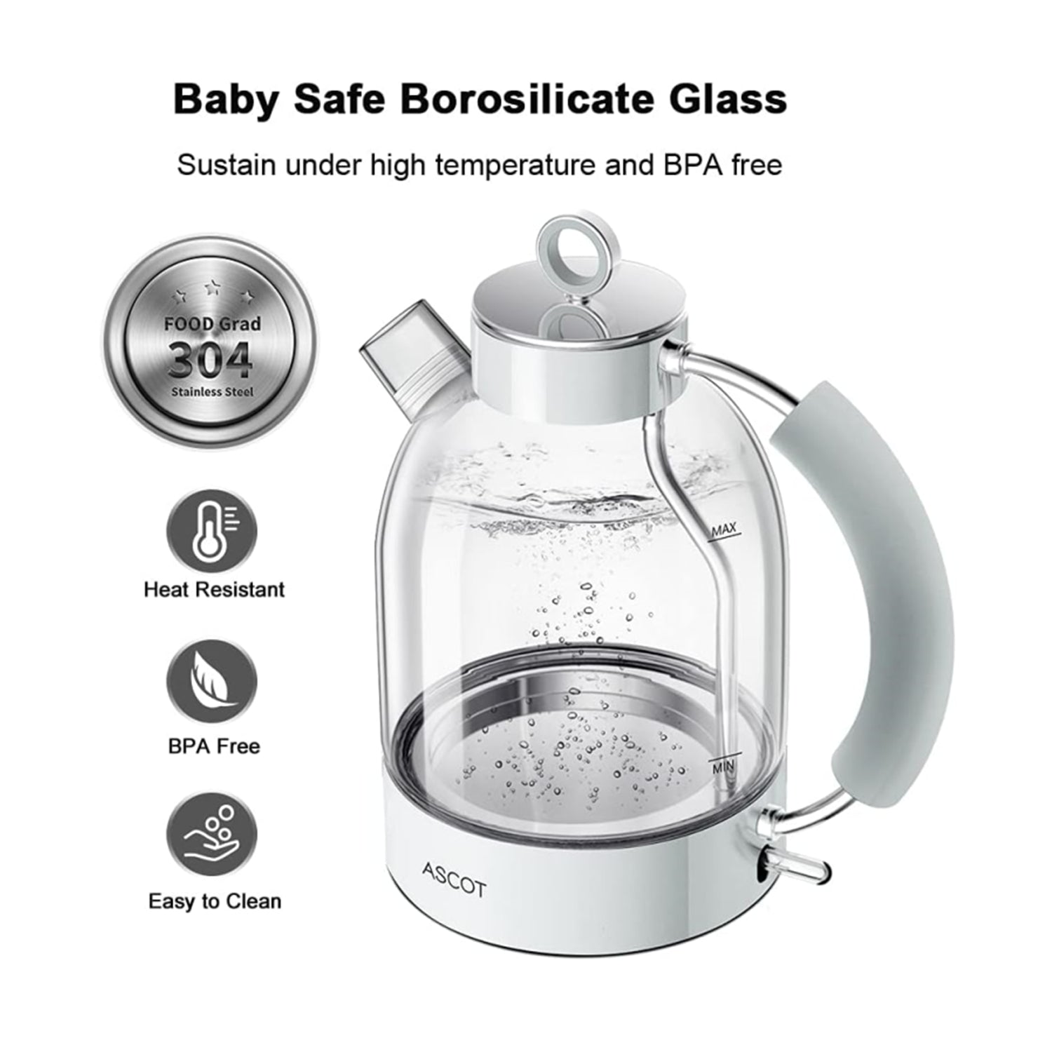 ASCOT glass electric kettle with unique design and beautiful appearance. Anti-scald handle, round spout, separate lid, and spout filter are handmade by experienced craftsmen under strict quality standards.