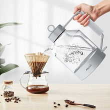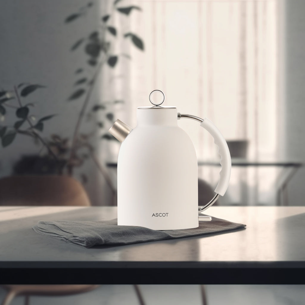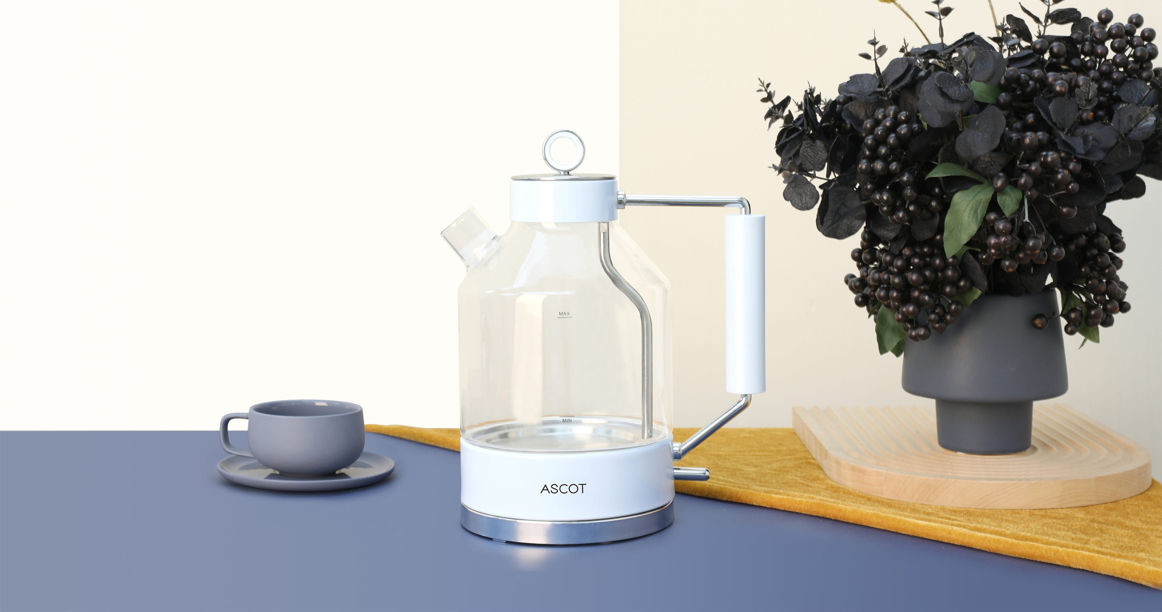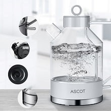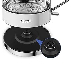 ASCOT glass electric kettle with unique design and beautiful appearance. Anti-scald handle, round spout, separate lid, and spout filter are handmade by experienced craftsmen under strict quality standards.