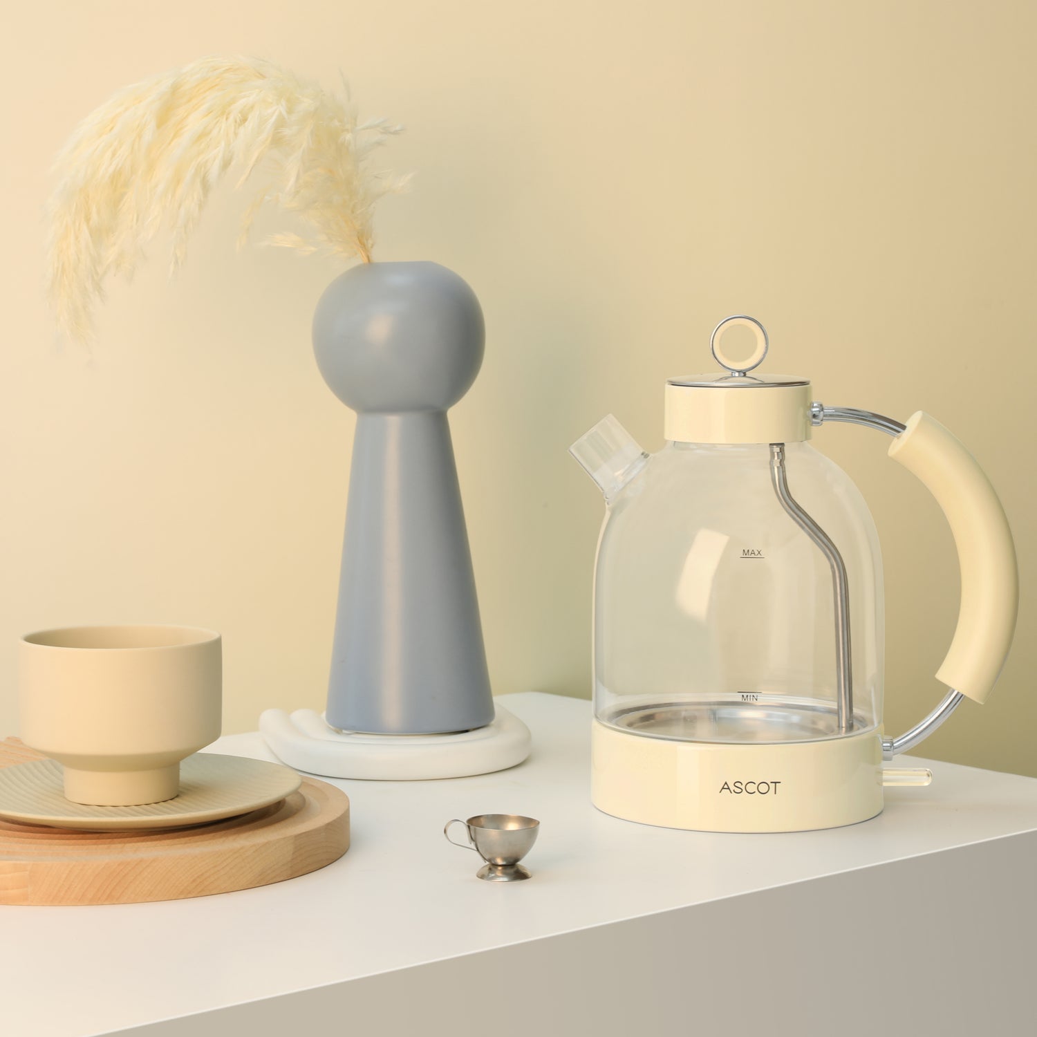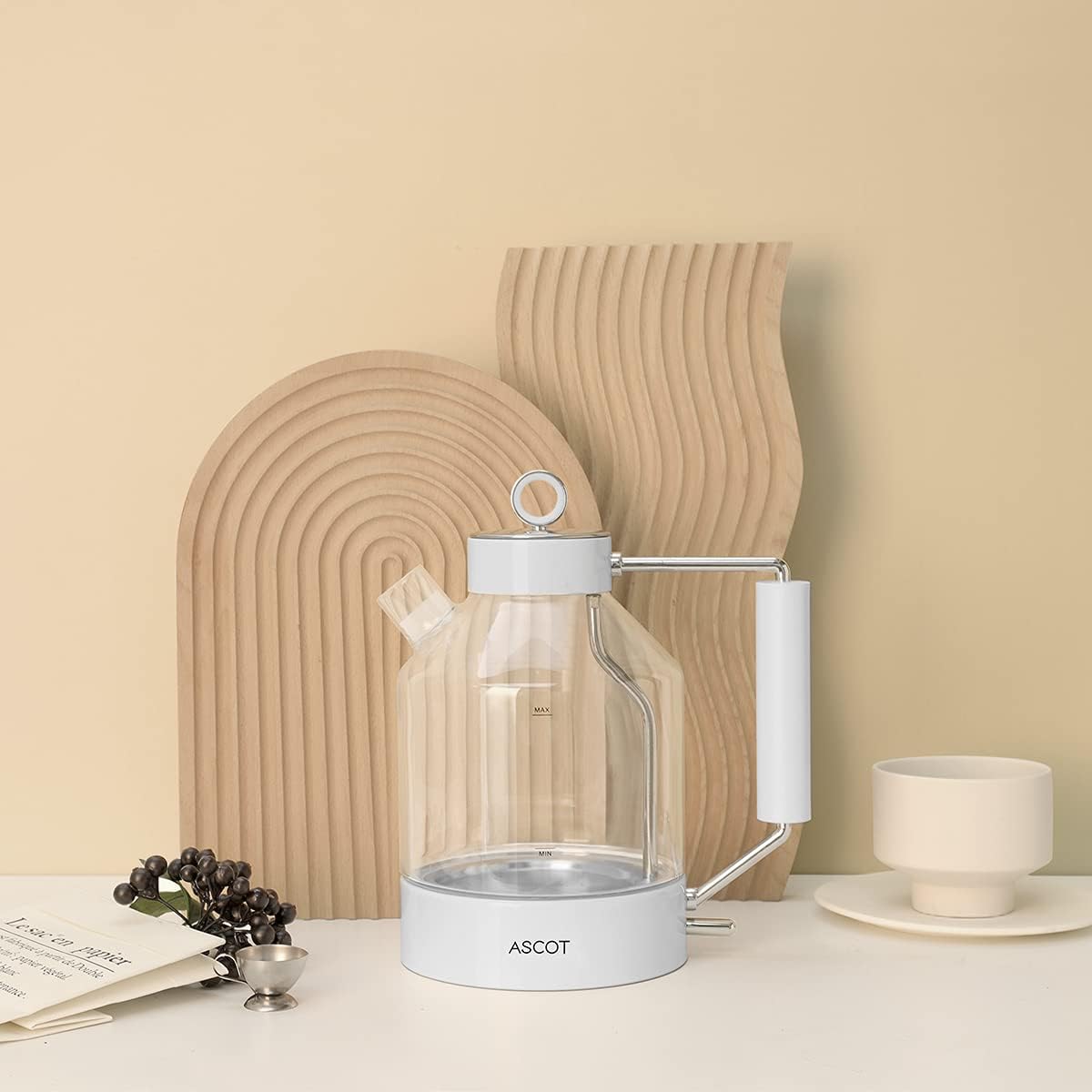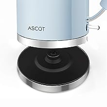 ASCOT stainless steel electric kettle with unique design and beautiful appearance. Anti-scald handle, round spout, separate lid, and spout filter are handmade by experienced craftsmen under strict quality standards.